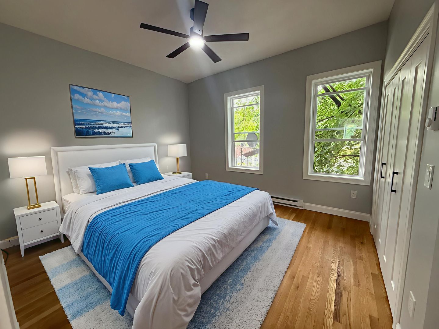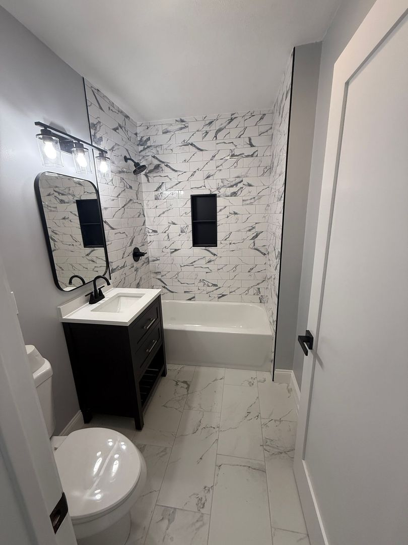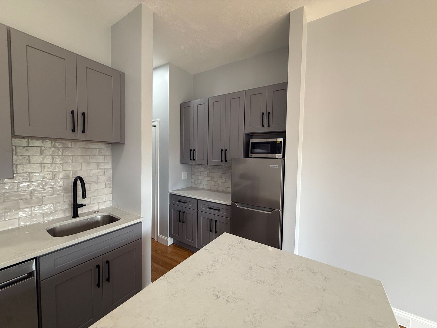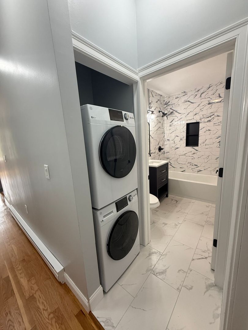 Newly renovated unit featuring hardwood floors, granite counters, stainless steel appliances, a modern bathroom, in-unit laundry, and great natural light!